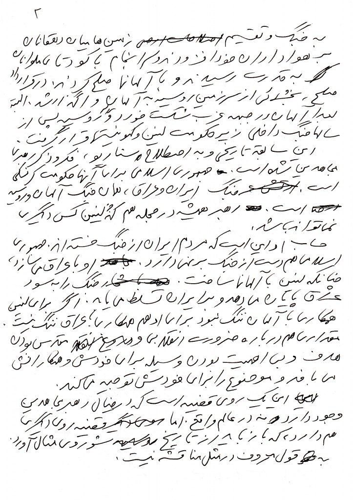 حساب او این است که مردم ایران از جنگ خستهاند. جمهوری اسلامی هم دست از جنگ برنمی دارد. او با عراق میسازد، چنانکه لنین با آلمانها ساخت. جنگ را به سود عراق پایان میدهد و برایران تسلط مییابد. اگر برای لنین همکاری با آلمان ننگ نبود برای او هم همکاری با عراق ننگ نیست. مقداری هم در باره ضرورت انقلابی و مقدس بودن هدف و بیاهمیت بودن وسیله برای خودش و همکارانش میبافد و موضوع را برای خودش توجیه میکند.